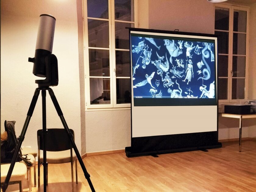 Bei ungünstigen Wetterbedingungen kommentierte Himmelswanderung und Himmelsbeobachtung in geschlossenen Räumen mithilfe einer astronomischen Simulationssoftware und zuvor aufgezeichneten Beobachtungssequenzen mit dem Teleskop.