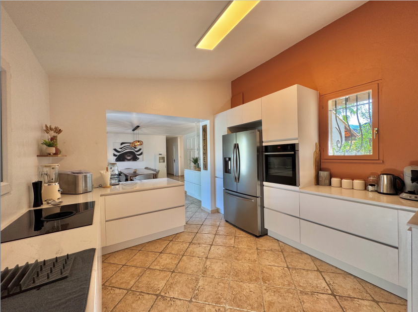 Die ebenerdige und voll klimatisierte Villa bietet: • Geräumigen und hellen Wohnbereich: eine voll ausgestattete offene Küche (amerikanischer Kühlschrank, Backofen, Mikrowelle, Geschirrspüler, Eismaschine usw.), eine Speisekammer (Waschmaschine und Kühl-/Gefrierschrank), ein Esszimmer und ein Wohnzimmer. • 5 Schlafzimmer, 1 Büro und 3 Badezimmer: