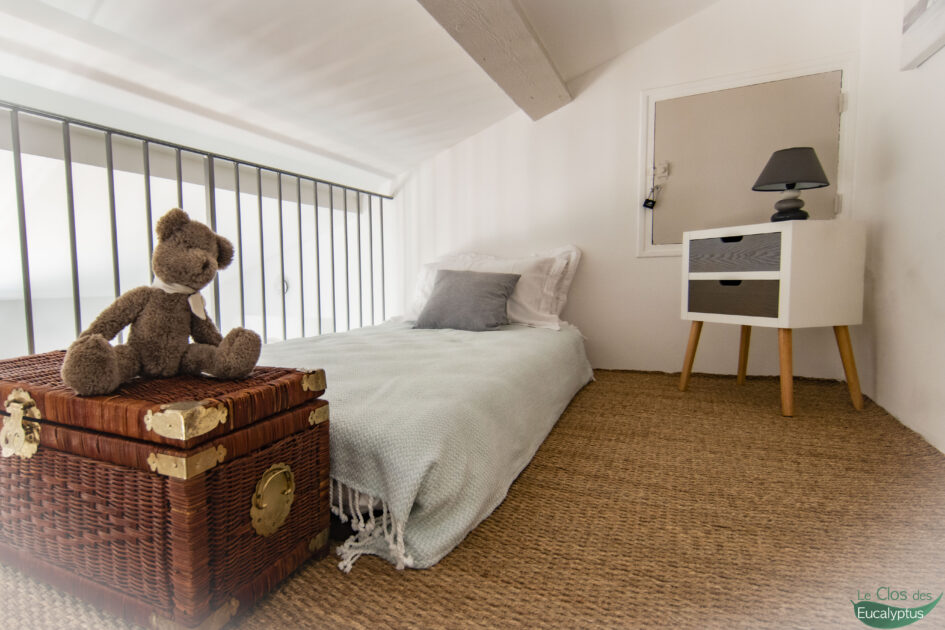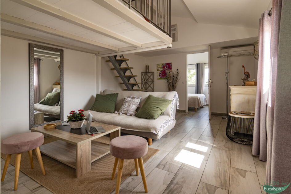 Diese helle, unabhängige, nicht einsehbare Wohnung verfügt über ein großes Wohnzimmer mit Mezzanin, ein separates Schlafzimmer, eine Veranda mit einer ausgestatteten Küche, die sich zu einer großen, begrünten Terrasse mit Gartenmöbeln öffnet, freier Blick auf die Hügel, raffinierte zeitgenössische Dekoration. Die Betten sind bezogen, Hand- und Geschirrtücher werden gestellt.