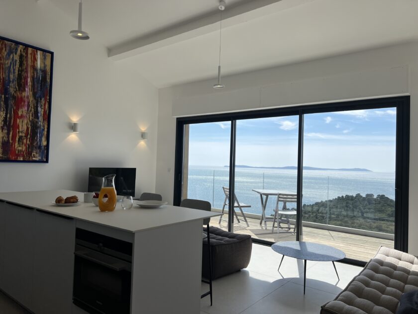 Air-conditioned 47 m² T2 apartment, renovated in 2023, located on the second floor of a villa. Quiet, leafy setting. Private terrace with panoramic sea view, facing Île du Levant. Access by stairs only.