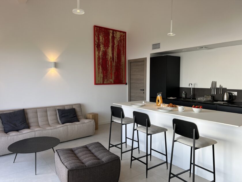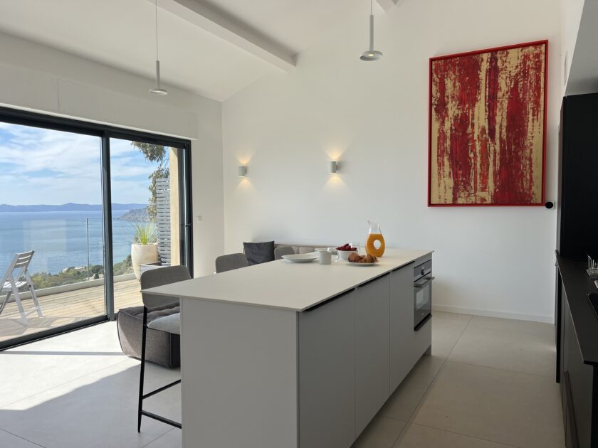 On the second floor of a villa, bathed in light and facing the sea, this contemporary-style apartment features an open kitchen with living area and private terrace.