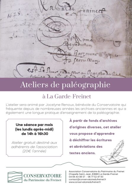 A partir du fonds d'archives communales de La Garde-Freinet et d'actes notariés d'origines variées, cet atelier vous propose d'apprendre à déchiffrer les écritures et abréviations des textes anciens. Mais il ne suffit pas de les transcrire, il faut ensuite les lire et comprendre les expressions et leur signification dans le contexte de l'époque, l'occasion de faire un saut dans le temps pour vous plonger dans l'histoire locale et leurs préoccupations parfois très proches des nôtres.