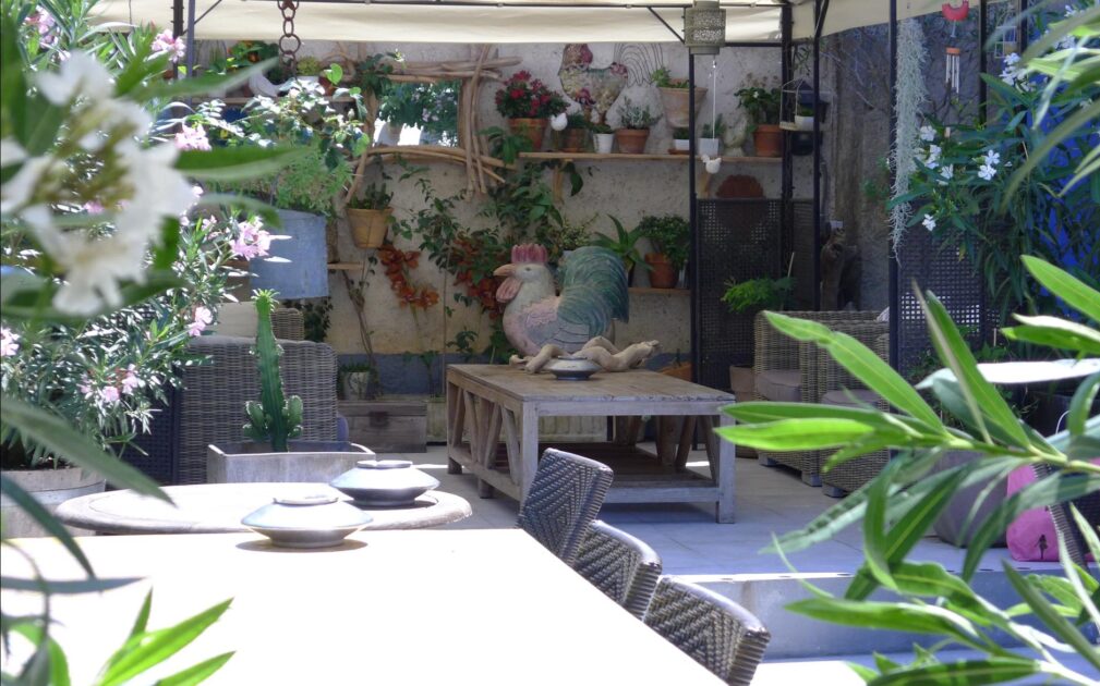 Le Coq hôtel est un hôtel provençal rempli de charme. Il est agréable de se reposer sur la terrasse bordée de végétations.