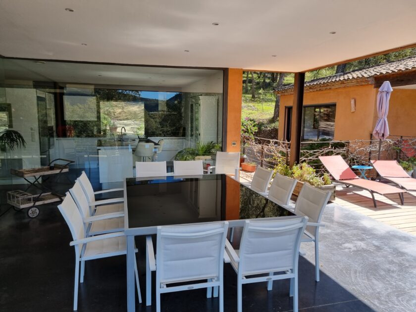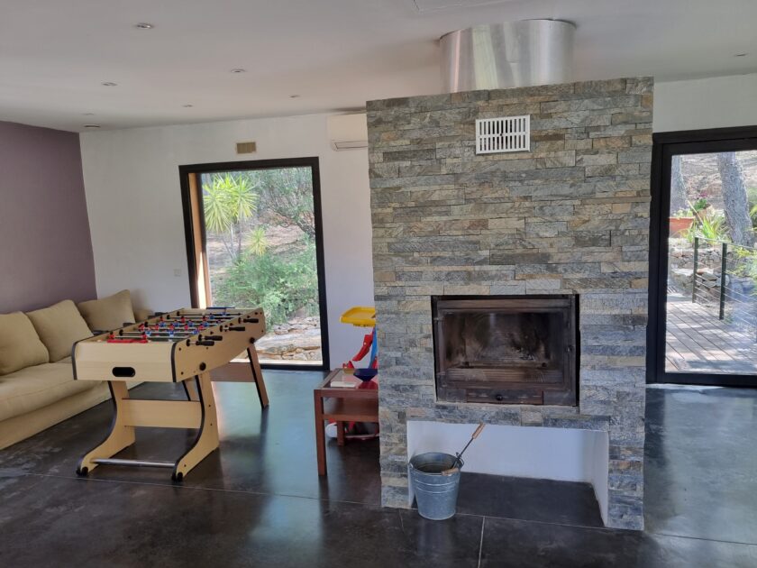 Un barbecue à charbon avec sa petite cuisine d’été est bâti au bord de la piscine. Celle-ci (11x5) est protégée par un volet roulant automatique, pour la sécurité des grands et des petits.