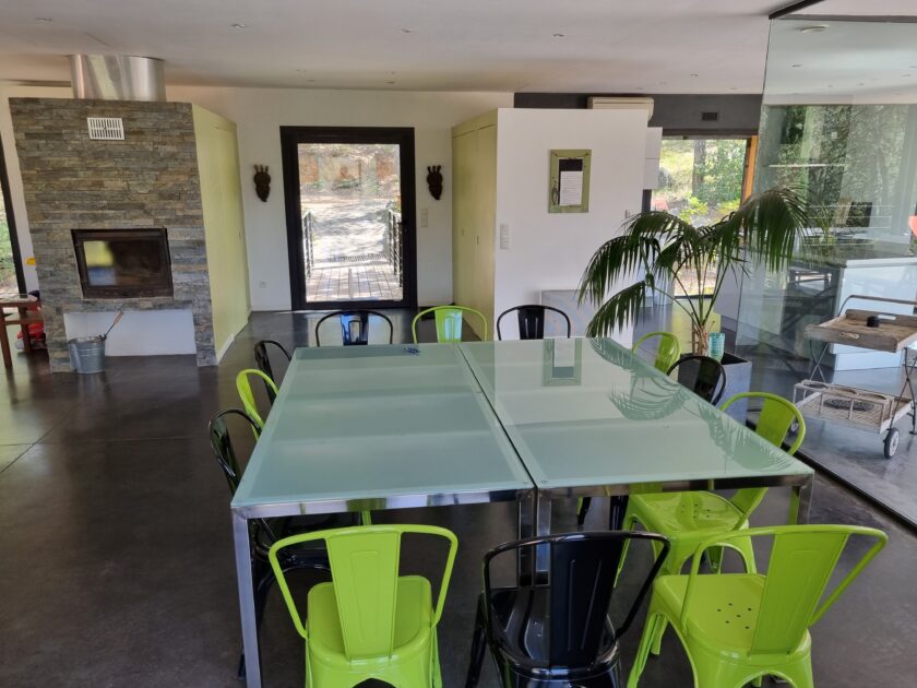 L’espace extérieur est agrémenté d’un terrain de pétanque et d’une table de ping-pong.