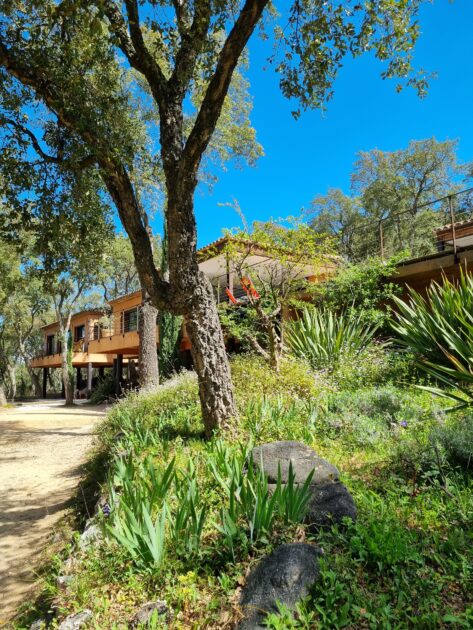 C’est en traversant une passerelle aux murs et au toit de verre que l’on accède au premier module des chambres dans lequel se trouve une chambre double avec salle de bains et toilettes et deux autres chambres doubles, chacune avec sa salle d’eau. Ces trois chambres, ont toutes accès à un grand balcon par lequel elles peuvent communiquer, et une passerelle donnant directement sur l’extérieur.
