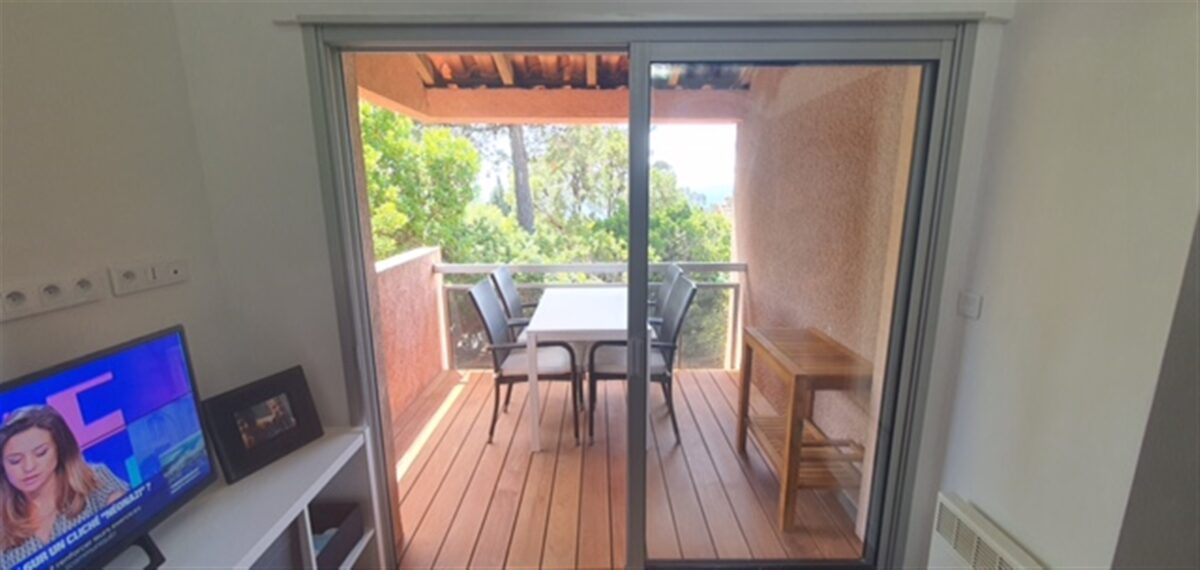 Appartement au Canadel au 1er étage avec vue mer, cuisine équipée, une chambre avec tv, salle de bain, wc indépendant et une terrasse de 5m2...idéal pour passer d'agréables vacances.
