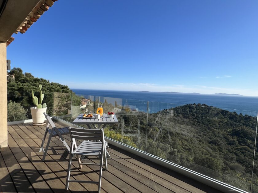 Appartement T2 de 47 m², climatisé, rénové en 2023, situé au premier étage d’une villa. Environnement calme et verdoyant. Terrasse privée offrant une vue panoramique sur la mer, face à l’Île du Levant. Accès uniquement par des escaliers.