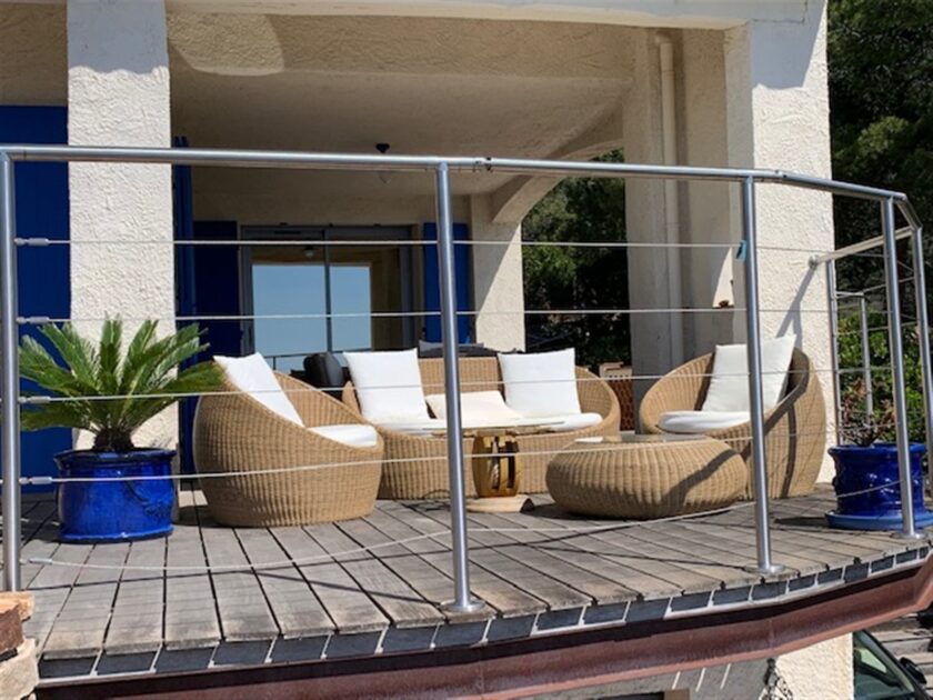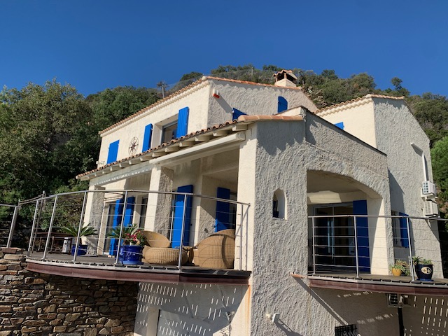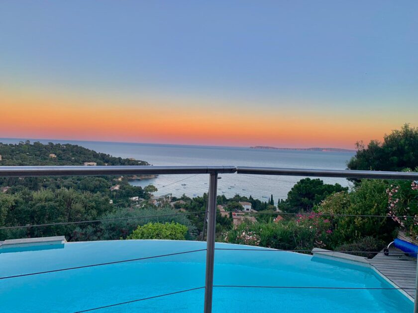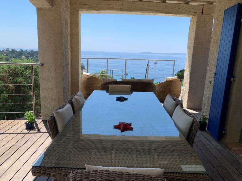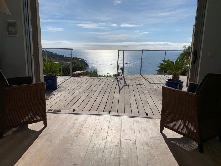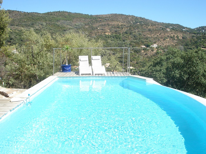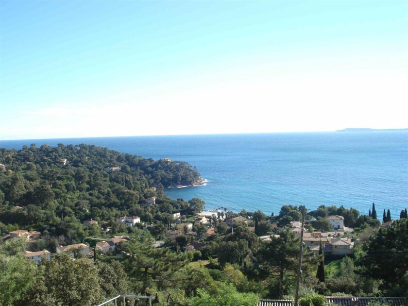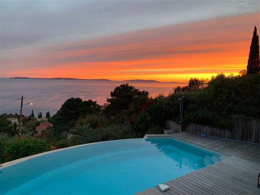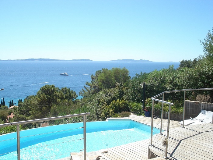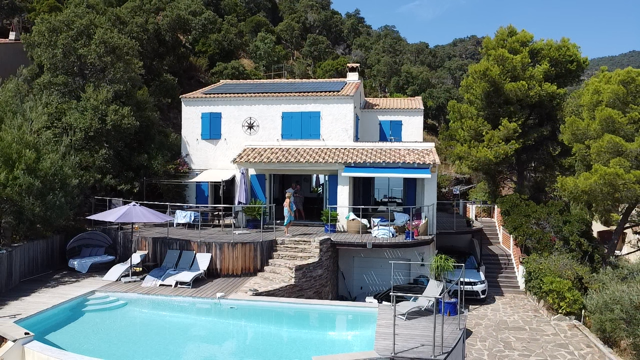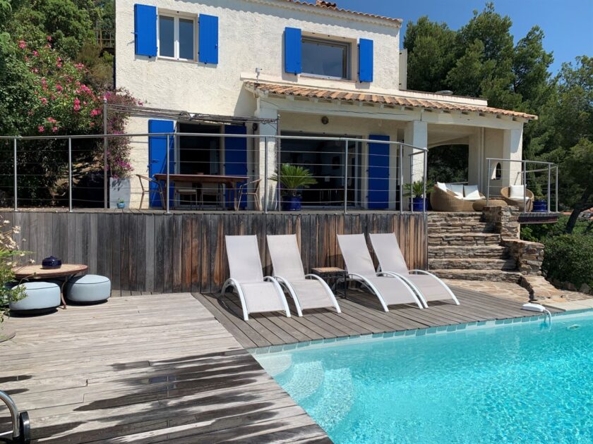 Splendide villa avec vue panoramique sur la mer et les îles d'or. 180m², exposée Sud, sur 2100m² de colline boisée, grande terrasse et solarium, pas de vis-à-vis, proximité plage (400m, 800m par route). Piscine à débordement, chauffée si besoin.