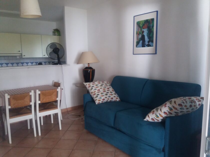 Appartement climatisé avec jolie vue sur mer dans villa individuelle. L'appartement T2, 45 m2, se trouve à 500 m de la plage et à 300 m du village. Il est équipé d'une terrasse avec mobiliers de jardin et transats. Chambre avec double-lit 160 x 200 cm et séjour avec canapé-lit de haute qualité 160 x 200 cm. Cuisine toute équipée, lave-vaisselle, lave-linge, plaques de cuisson vitrocéramique, parking sur le terrain, jardin à disposition de tous les locataires (en tout 3 appartement).